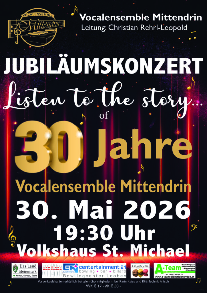 Jubiläumskonzert 30 Jahre Vocalensemble Mittendrin am 30. Mai im Volkshaus St.Michael Jubiläumskonzert, Vocalensemble Mittendrin, Volkshaus St.Michael Jubiläumskonzert 30 Jahre Vocalensemble Mittendrin am 30.Mai im Volkshaus St.Michael